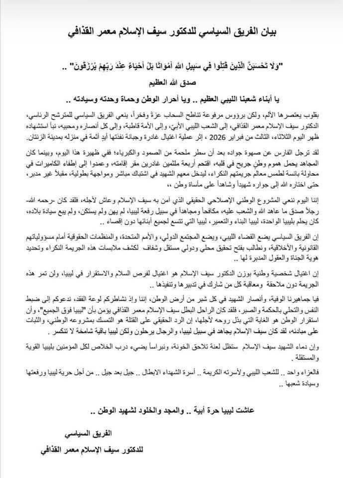 “إذاعة فرنسا الدولية” تكتب عن وفاة سيف الإسلام القذافي.. نظرة إلى الوراء على المسار المتعثر لخلافة ليبيةتقارير4 فبراير, 8:42