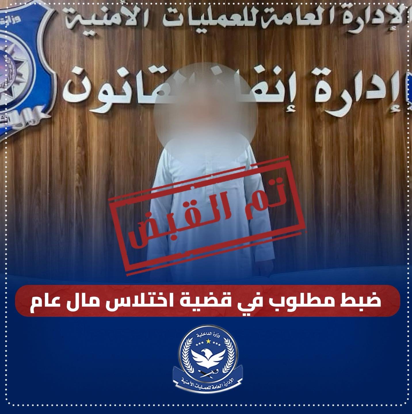 أعلنت إدارة إنفاذ القانون بالإدارة العامة للعمليات الأمنية إلقاء القبض على المدعو (ظ. أ. ال. أ)، المطلوب لدى النيابة العامة على ذمة قضية اختلاس مال عام مقيدة تحت رقم (2012/154).