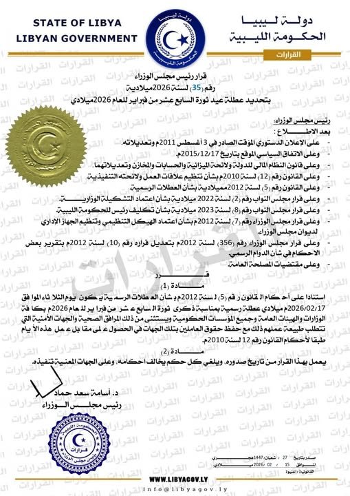 أصدر رئيس الحكومة الليبية المكلفة من مجلس النواب “أسامة حماد”، اليوم الإثنين، بإعتبار يوم غدٍ الثلاثاء عطلة رسمية بمناسبة الذكرة الخامسة عشر لثورة 17 فبراير.