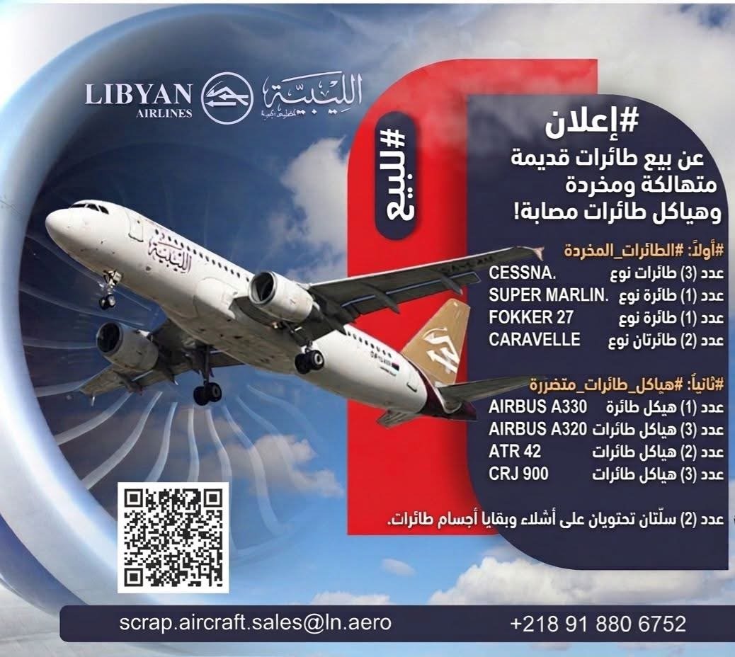 أعلنت شركة الخطوط الجوية الليبية، عن رغبتها في بيع طائرات قديمة متهالكة ومخردة، وأشلاء وهياكل طائرات متضررة بمطار طرابلس العالمي.
