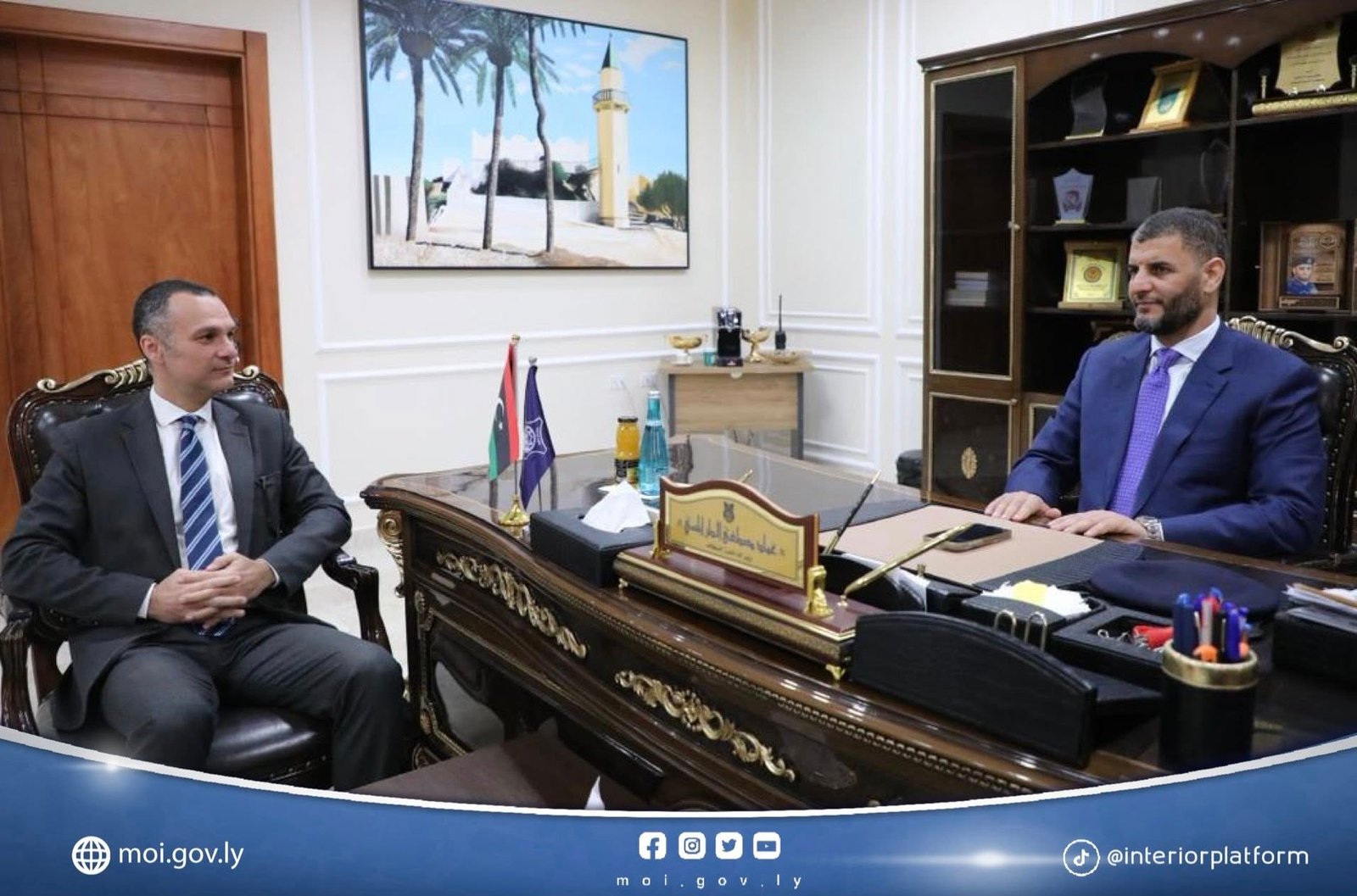 بحث وزير الداخلية المكلّف بحكومة الوحدة اللواء عماد الطرابلسي، أمس الثلاثاء بمكتبه بديوان الوزارة في طرابلس، مع القائم بأعمال سفارة مصر لدى ليبيا تامر الحفني، ملف الهجرة غير الشرعية وسبل التعامل معه وفق الإطار القانوني والإنساني، إلى جانب متابعة إجراءات ترحيل عدد من المهاجرين، بما يضمن احترام القوانين الوطنية والاتفاقيات ذات الصلة.