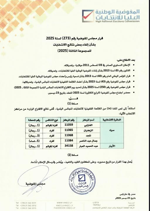 أعلنت المفوضية الوطنية للإنتخابات إلغاء نتائج الإنتخابات البلدية في خمسة مراكز ببلديتي سرت والأبيار عقب تأكيد وقوع خروقات ومخالفات داخلها.
