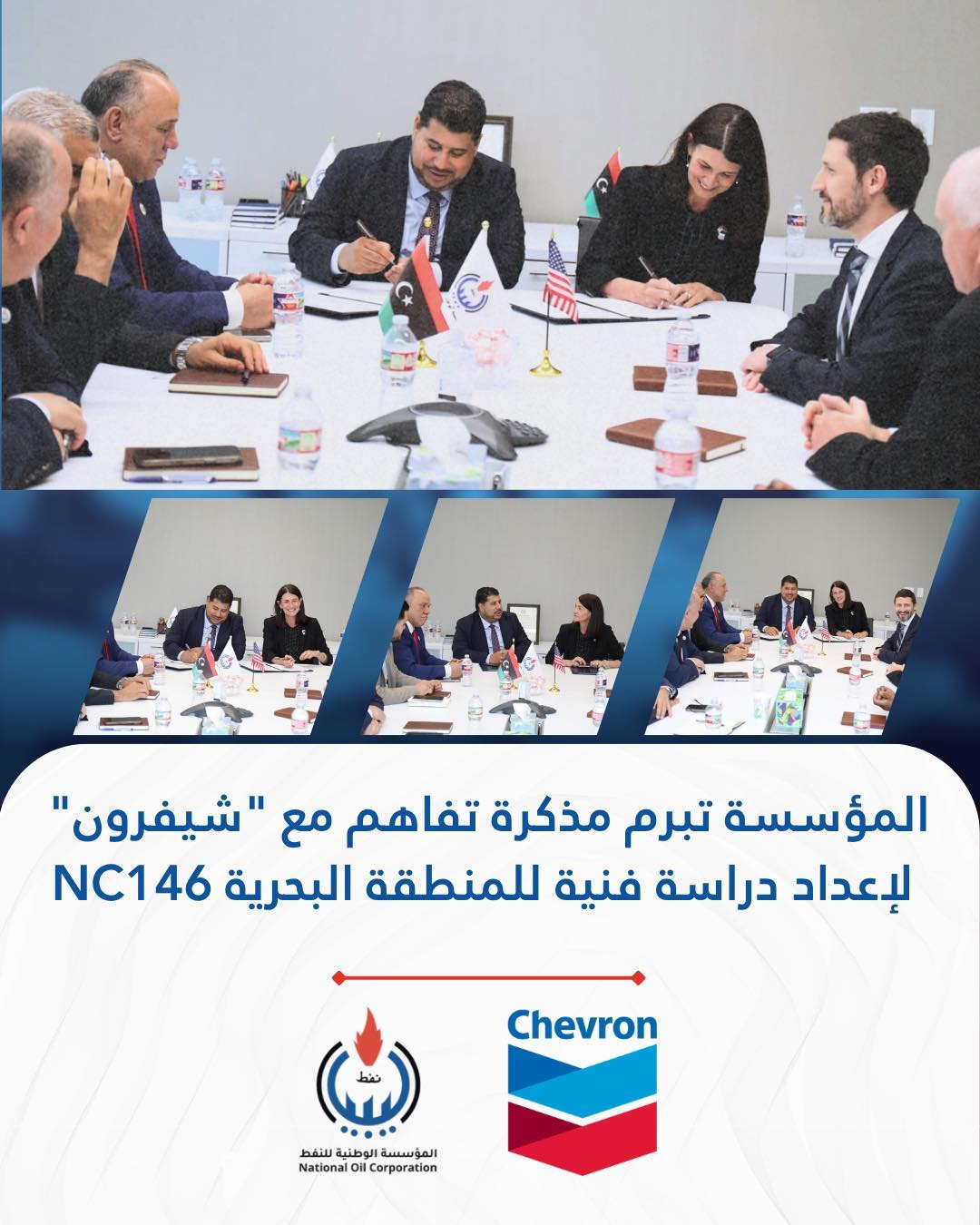 أعلنت المؤسسة الوطنية للنفط توقيع مذكرة تفاهم مع شركة “شيفرون الأمريكية” لإجراء دراسة فنية متكاملة للمنطقة البحرية NC146.