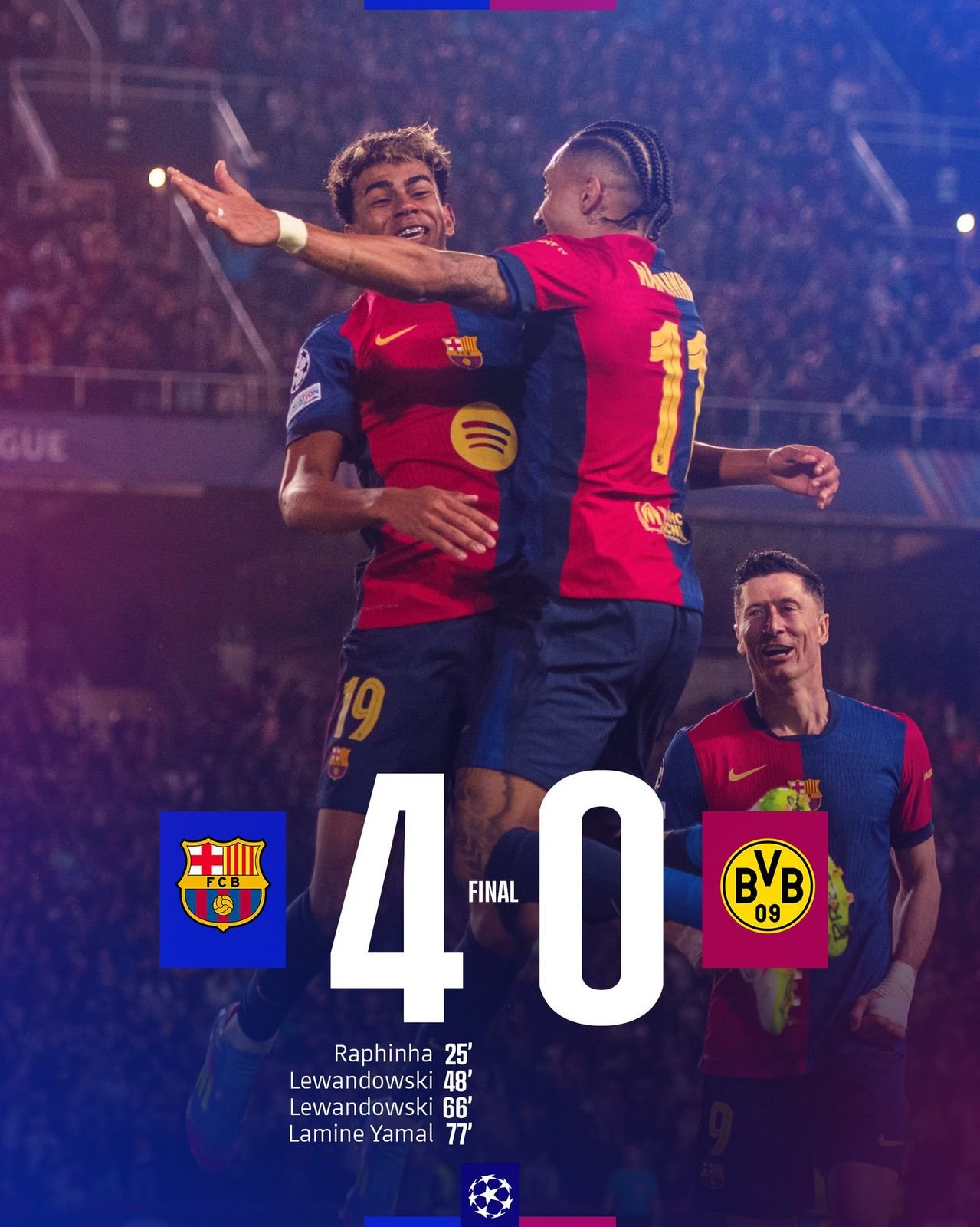 وبعد 3 دقائق من صافرة بداية الشوط الثاني تمكن روبرت ليفاندوفسكي من تسجيل الهدف الثاني, ثم الثالث في الدقيقة 66. واضاف النجم الصاعد, المغربي لامين جمال لمسته الى المبارة بالهدف الرابع في الدقيقة 77.