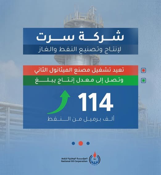 جاء ذلك في بيان للمؤسسة الوطنية للنفط، قالت فيه أن هذه الخطوة تعزز قدرات شركة سرت الإنتاجية وتنويع منتجاتها، مُشيرةً إلى إرتفاع إنتاج النفط الخام اليوم ليصل إلى 114,000 برميل، وهو معدل يعكس “تحسن كبير في الأداء والعمل بجد وإخلاص لتحقيق المستهدفات”.