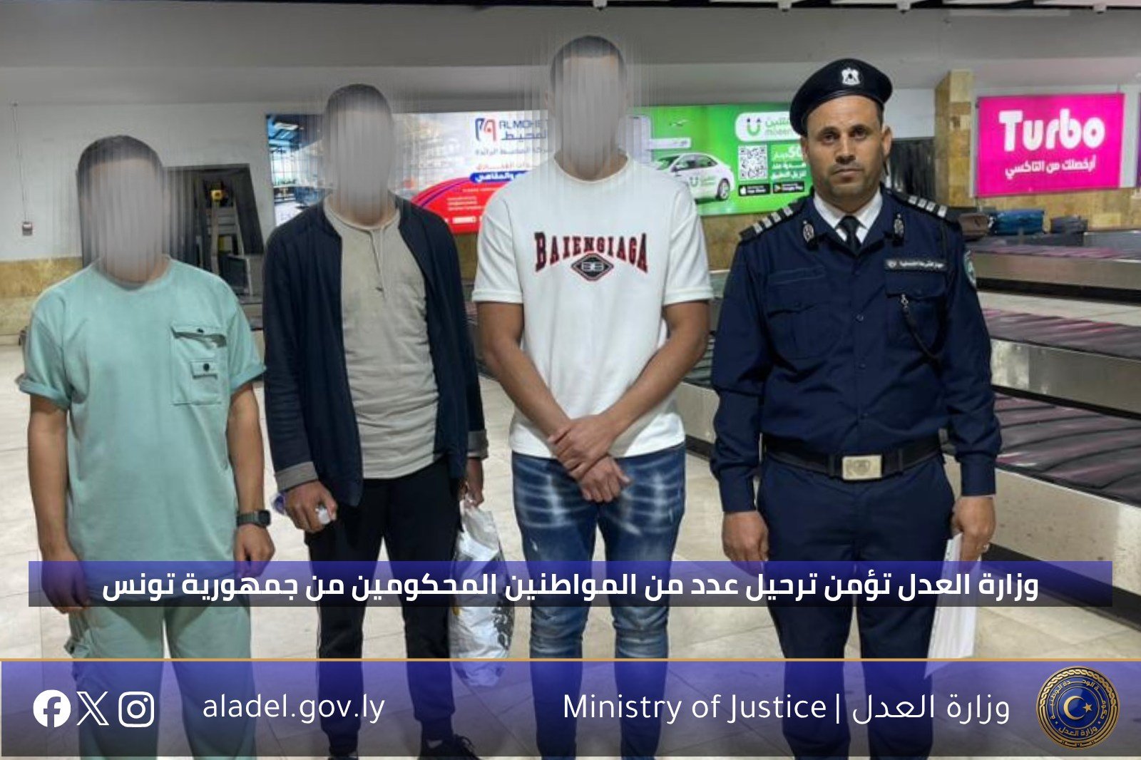 أعلنت وزارة العدل بحكومة الوحدة عن تأمين عودة ثلاثة مواطنين ليبيين كانوا يقضون عقوبات سالبة للحرية في تونس، في إطار جهودها لمتابعة أوضاع السجناء الليبيين في الخارج.