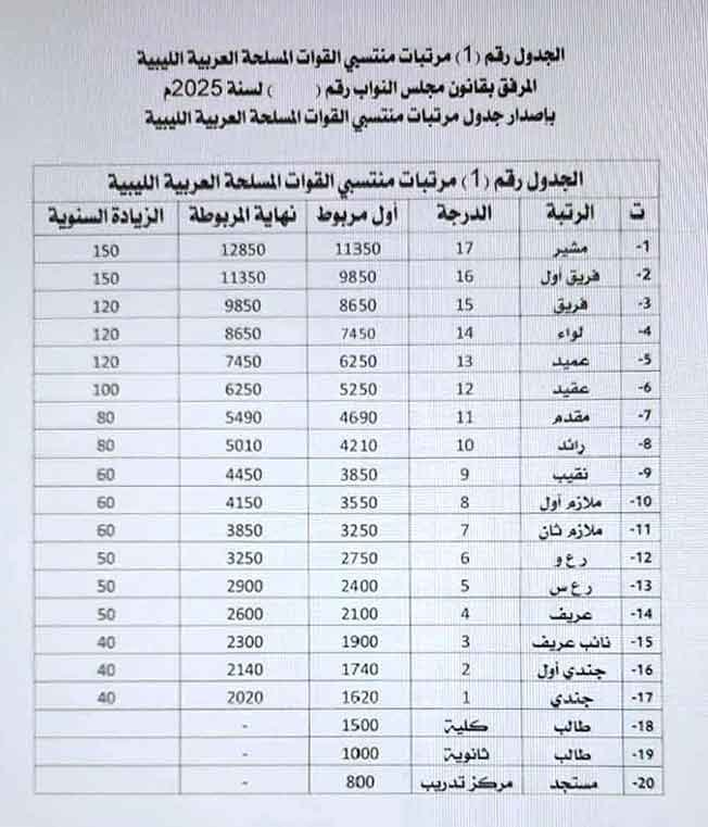 أقر مجلس النواب جدولا جديدا لمرتبات منتسبي القوات المسلحة العربية الليبية لسنة 2025، أمس الاثنين، متضمنًا زيادة تصل إلى 150%، مع أعلى راتب يصل إلى 12 ألفاً و850 دينارًا لرتبة المشير، وأقل راتب 800 دينار للمستجد بمراكز التدريب.