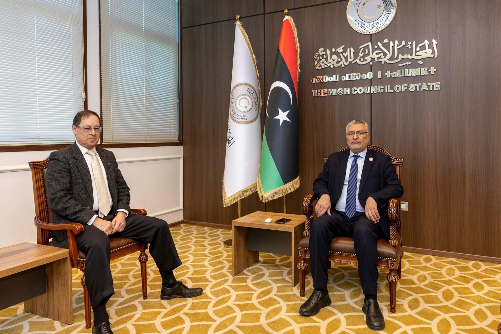 بحث رئيس المجلس الأعلى للدولة، الدكتور محمد تكالة، أمس الخميس، بمقر المجلس في العاصمة طرابلس، مع سفير روسيا الاتحادية لدى ليبيا، حيدر أغانين، مستجدات الأوضاع السياسية في البلاد، والجهود الرامية إلى كسر حالة الجمود والدفع بالعملية السياسية نحو مسارات أكثر فاعلية.