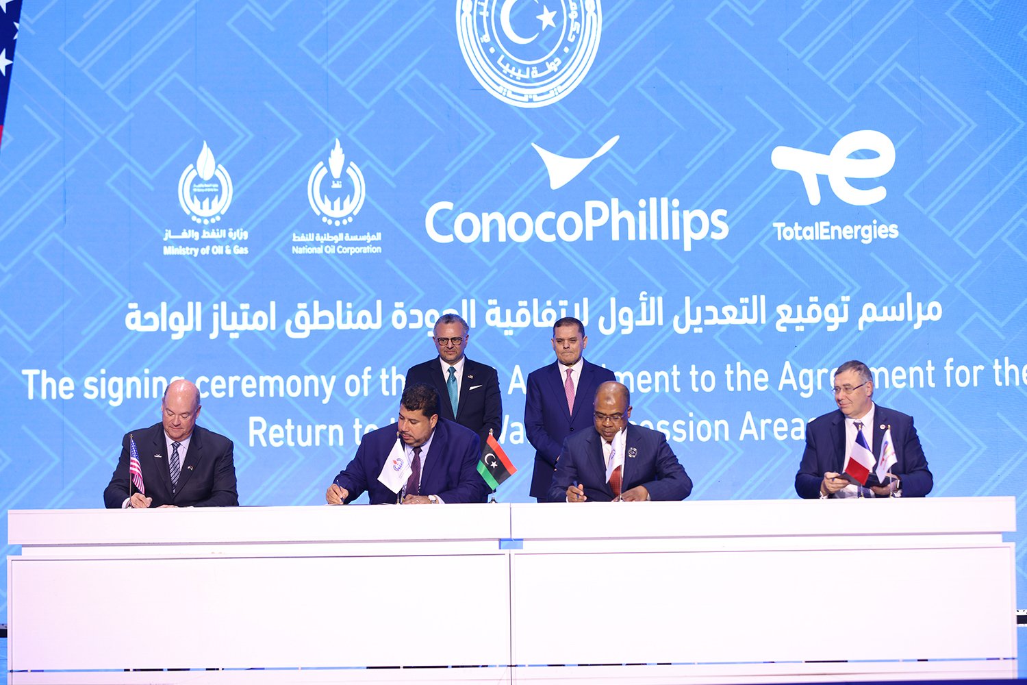 وقعت حكومة الوحدة الوطنية حزمة اتفاقيات ومذكرات تفاهم استراتيجية في قطاع الطاقة، اليوم السبت، أبرزها توقيع اتفاق تطوير طويل المدى لمدة 25 سنة ضمن شركة الواحة للنفط بالشراكة مع توتال إنيرجيز الفرنسية وكونوكو فيليبس الأميركية، باستثمارات تتجاوز 20 مليار دولار بتمويلات خارجية دون تحميل الميزانية العامة أعباء إضافية، بهدف رفع إنتاج شركة الواحة إلى 850 ألف برميل يوميا، وبصافي إيرادات متوقعة للدولة يفوق 376 مليار دولار.