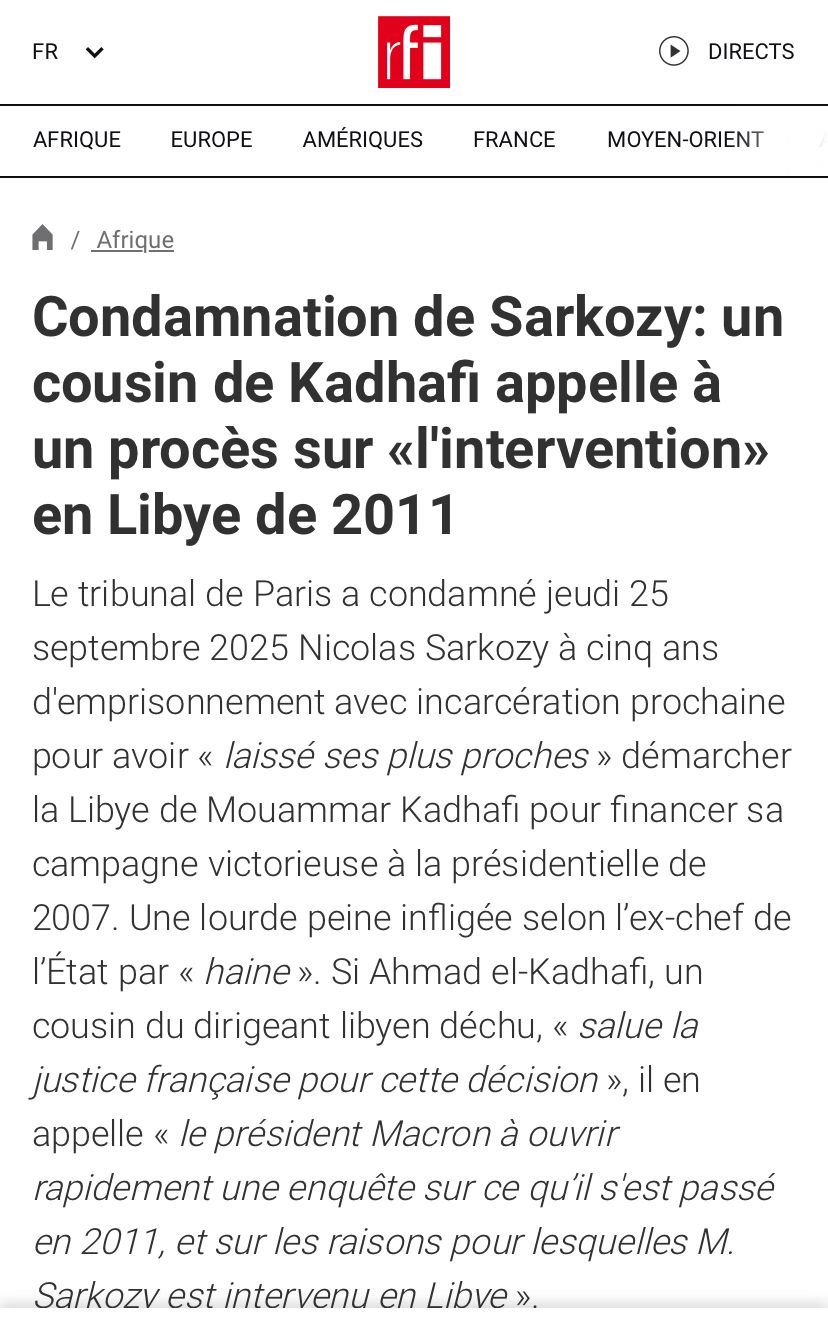 تناول راديو فرنسا الدولي ردود الفعل على قرار حكم القضاء الفرنسي بإدانة الرئيس الأسبق نيكولا ساركوزي بتهمة التآمر الجنائي في قضية تلقيه تمويلَا من الزعيم الليبي الراحل معمر القذافي لحملته الانتخابية الرئاسية عام 2007، وسجنه خمس سنوات، مع إمكانية حبسه، بتهمة “السماح لأقرب مساعديه” بالتواصل مع ليبيا بقيادة معمر القذافي لتمويل حملته الرئاسية.