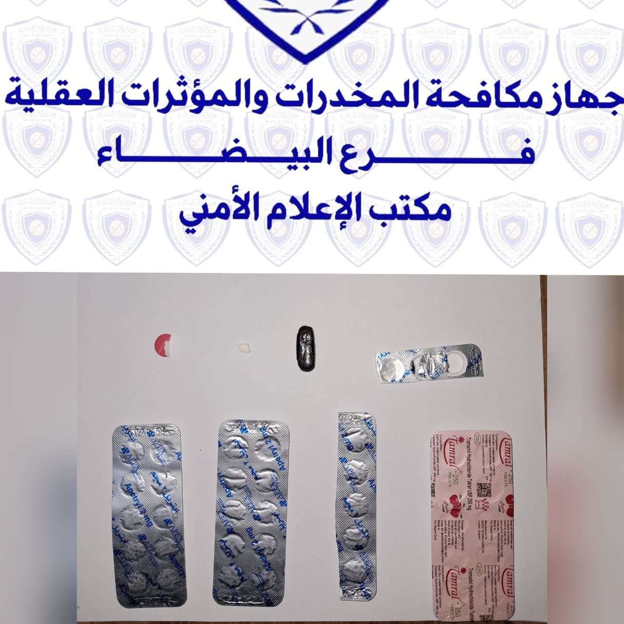 أعلن جهاز مكافحة المخدرات والمؤثرات العقلية فرع البيضاء من ضبط المدعو “م . ج . ا” أثناء تورطه في الاتجار بالمواد المخدرة، حيث عُثر بحوزته على 26 قرصًا وربع من نوع أبترل، و10 أقراص ونصف من نوع ترامادول، إضافة إلى قطعة من مخدر الحشيش.