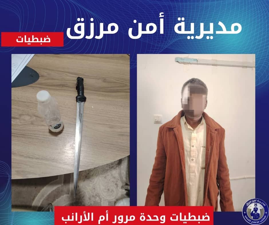 أعلنت مديرية أمن مرزق ضبط سائق دخل في مشاجرة مع أفراد وحدة المرور، وأشهر سلاحًا أبيض ذي حدّين باتجاه أحد رجال المرور، بعد الاشتباه بأن السائق في حالة سُكر ظاهر، عقب وقوع حادث سير على الطريق الرابط بين منطقتي أم الأرانب وحُميرة.