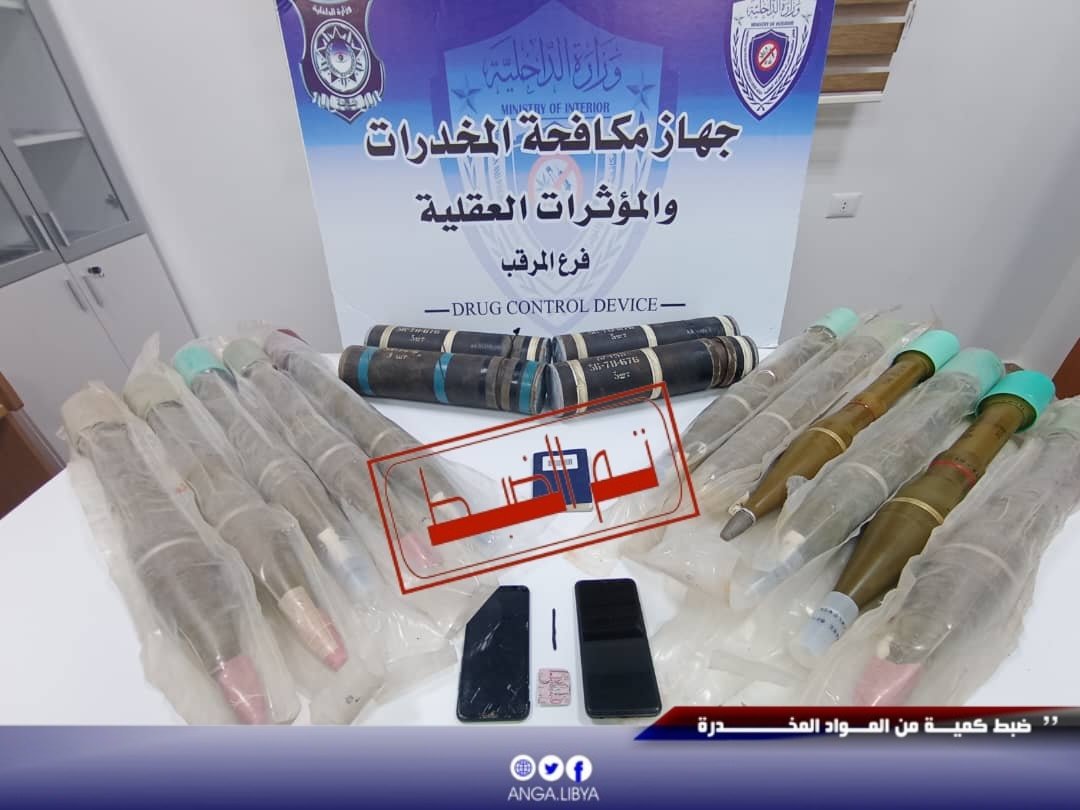 أعلن جهاز مكافحة المخدرات والمؤثرات العقلية تمكن فرقة التحري والقبض بفرع المرقب من ضبط شخصين يحملان الجنسية الليبية، وذلك بتهمة الاتجار بالمواد المخدرة وتجارة الأسلحة، حيث عُثر بحوزة أحد المتهمين على قطعة يُشتبه في كونها من مخدر الحشيش، بالإضافة إلى قرص يُشتبه في كونه من أقراص الهلوسة، فيما تم ضبط المتهم الآخر وبحوزته (11) قذيفة تعرف محلياً بـ”الدّانة”.