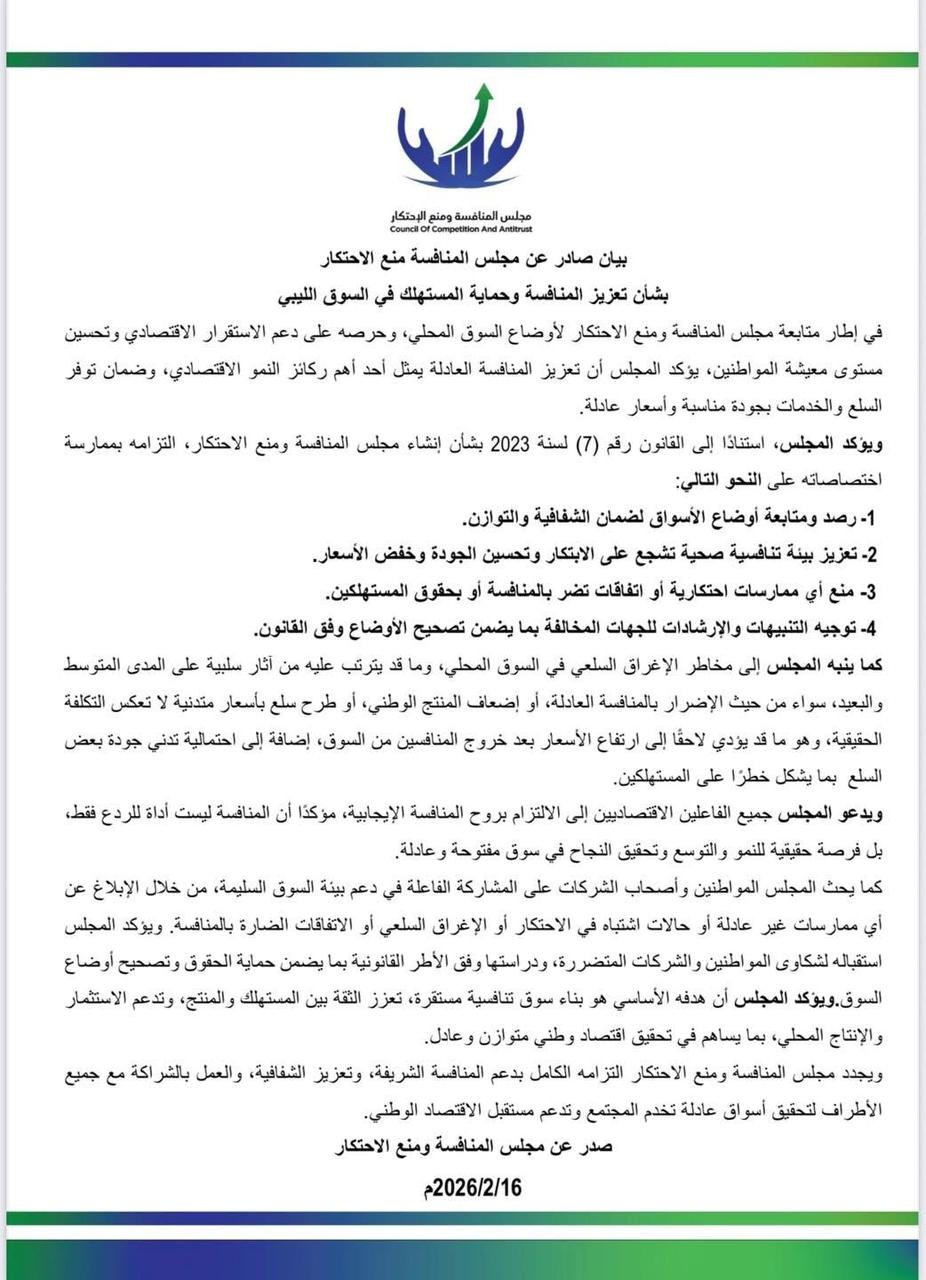 أكد مجلس المنافسة ومنع الاحتكار التزامه الكامل بتعزيز المنافسة العادلة في السوق الليبي ، محذرًا من مخاطر الإغراق السلعي والممارسات الاحتكارية التي قد تؤثر سلبًا في استقرار الأسعار وجودة السلع ومستوى معيشة المواطنين.