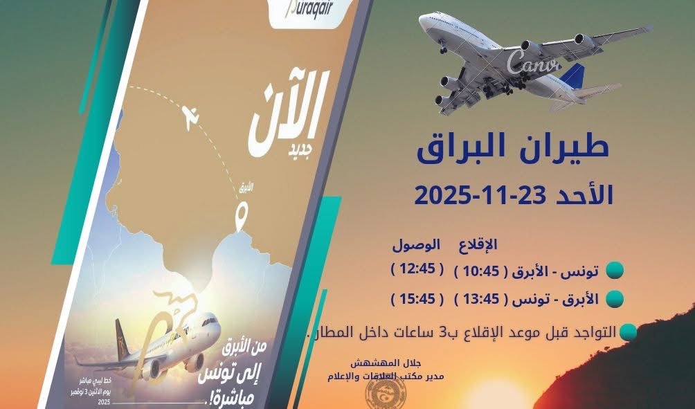 وأوضح “الناطق باسم المطار” في تصريحات صحفية له اليوم السبت، أن شركة البراق ستيسر رحلتين أسبوعيا من الأبرق إلى تونس، مشيرا إلى أن الرحلات الدولية ستقتصر حاليا على تونس فقط.