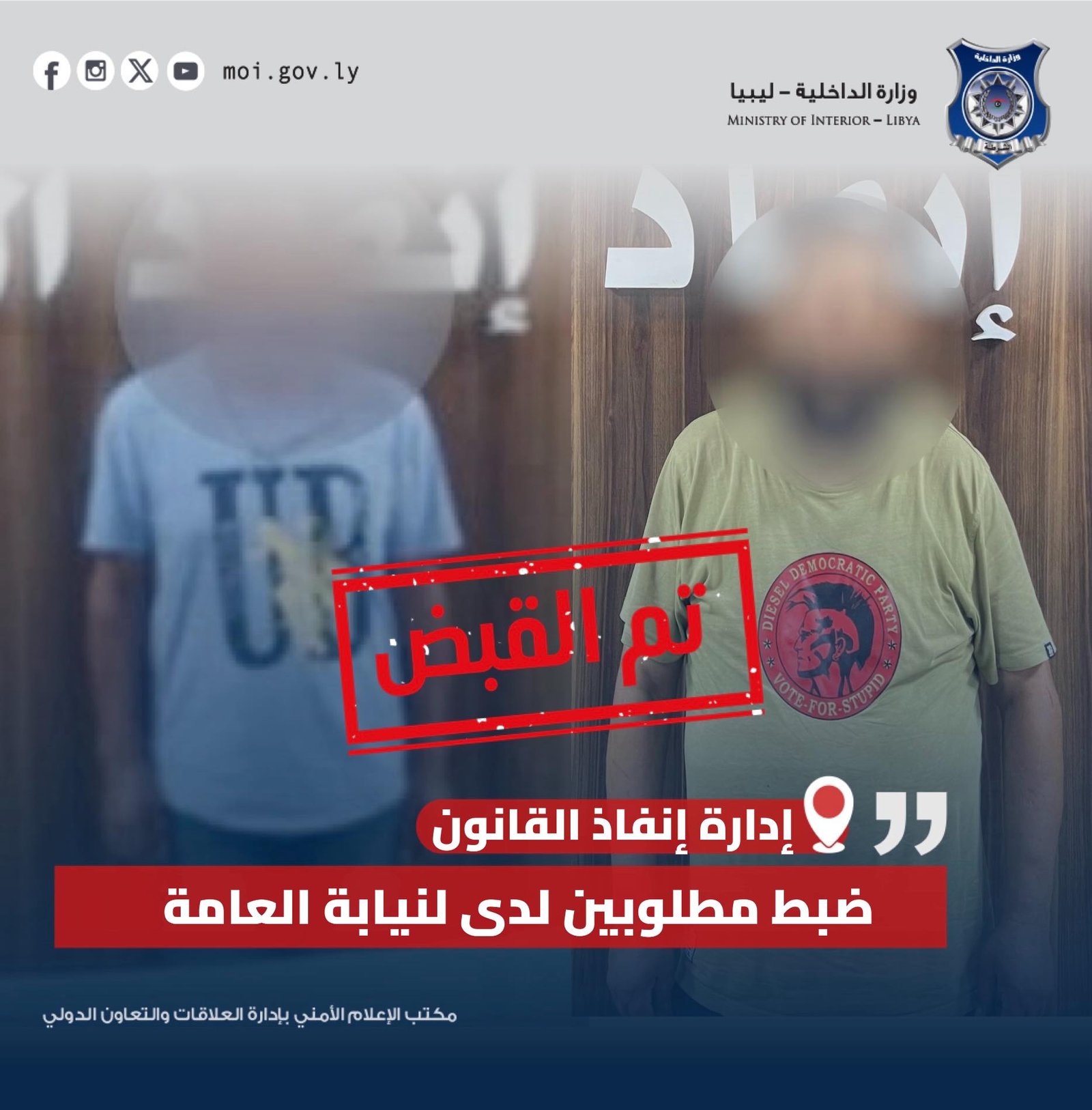 أعلنت وزارة الداخلية التابعة لحكومة الوحدة الوطنية عن تمكّن أعضاء وحدة التحري والتحقيقات التابعة للإدارة من ضبط مطلوبين لدى النيابة العامة.