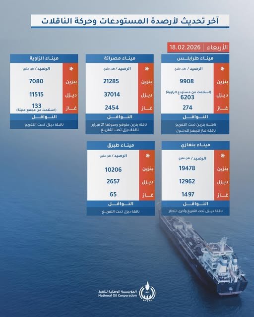 تقرير المؤسسة الوطنية للنفط الأربعاء 18 فبراير 2026 حول أرصدة الوقود الأساسية من بنزين وديزل وغاز في الموانئ والمستودعات الرئيسية، وحركة الناقلات لضمان استمرارية الإمدادات في جميع أنحاء ليبيا.