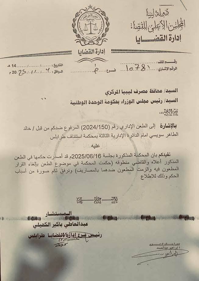 خاطبت إدارة القضايا بالمجلس الأعلى للقضاء، محافظ مصرف ليبيا المركزي ورئيس حكومة الوحدة الوطنية، بشأن حكم صادر عن محكمة استئناف طرابلس يقضي بإلغاء الضريبة المفروضة على بيع العملات الأجنبية.