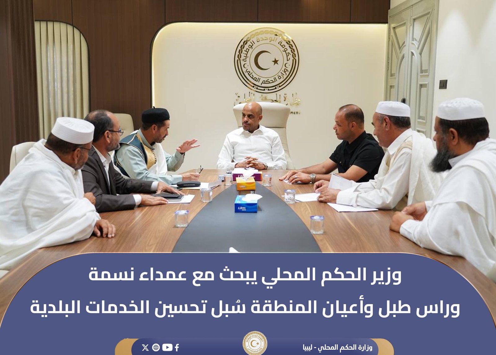 بحث وزير الحكم المحلي المكلف بحكومة الوحدة، “عبد الشفيع الجويفي”، في اجتماع مع عمداء بلديات نسمة وراس طبل وعدد من الأعيان والمشائخ، الأوضاع الخدمية والتنموية واحتياجات البلديات.