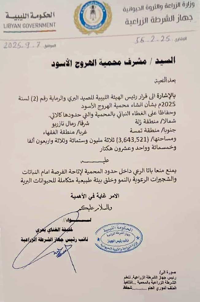صنف جهاز الشرطة الزراعية منطقة الهروج الأسود كمحمية طبيعية يُمنع فيها الرعي وإطلاق الإبل، وذلك في بيان موجه إلى مشرفي المحمية.