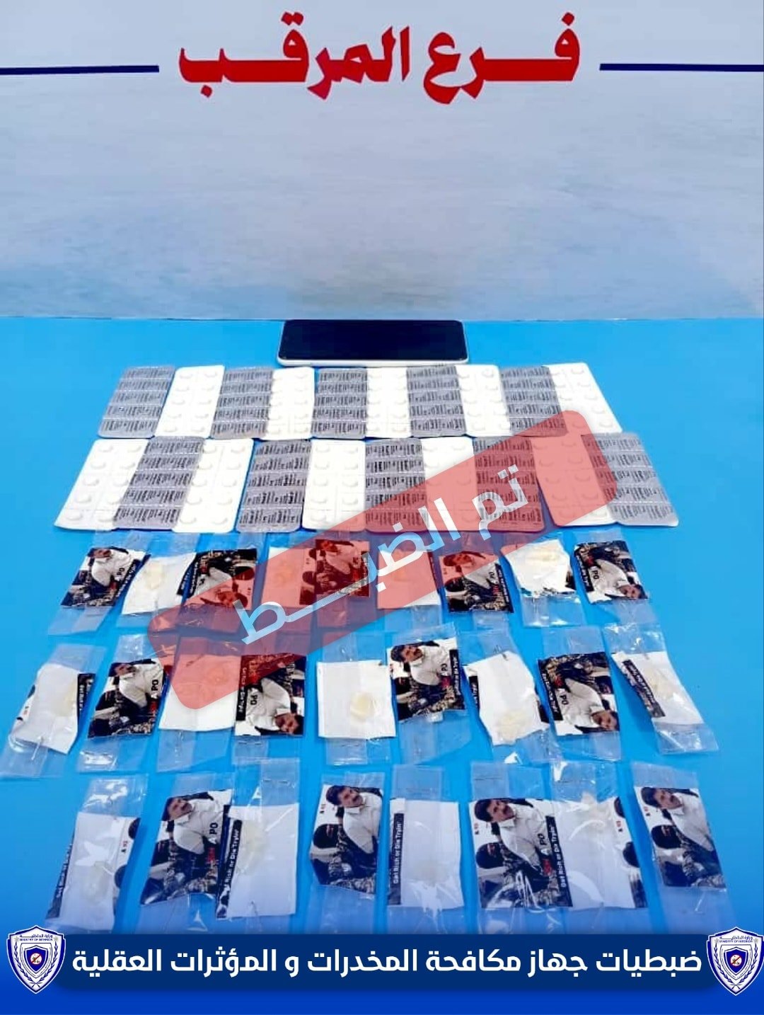 أعلن جهاز مكافحة المخدرات بالمرقب إلقاء القبض على أحد مروّجي المواد المخدرة بمنطقة سوق الخميس، بمدينة الخمس، عُثر بحوزته على عدد (199) قرصًا يُشتبه في كونها من المؤثرات العقلية، بالإضافة إلى (28) كيسًا يحتوي كل منها على مادة يُشتبه في كونها مخدر الكوكايين.