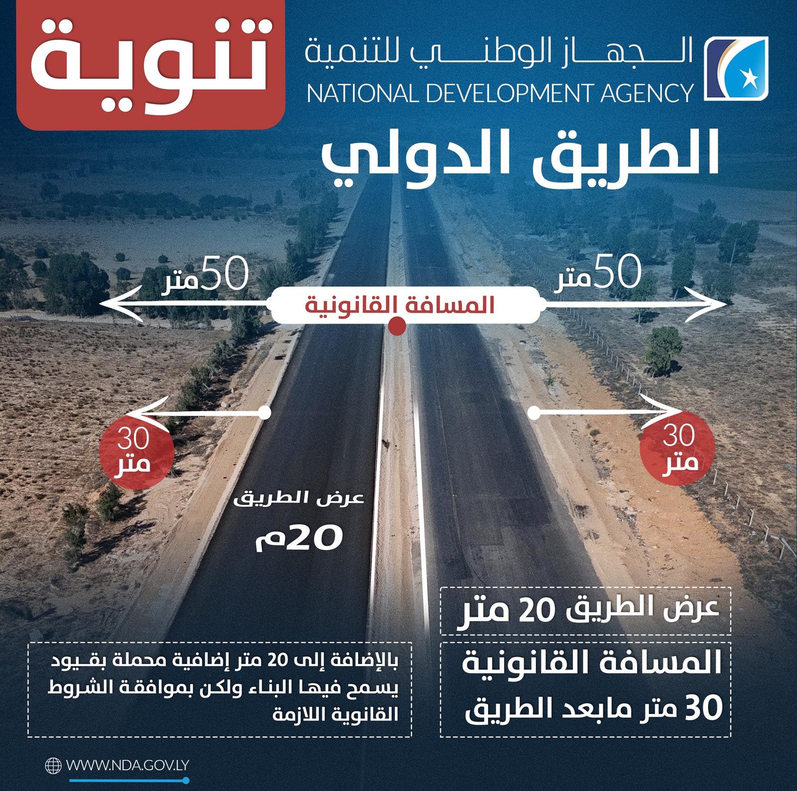 طالب الجهاز الوطني للتنمية جميع مّن يملكون أراضٍ بمحاذاة الطريق الدولي السريع الجديد، بضرورة الالتزام التام بضوابط حرم الطريق، والمحدّد بـ 50 مترًا، موزعة بواقع 20 مترًا من منتصف الطريق في كل اتجاه، إضافة إلى 30 مترًا كحرم إضافي في الإتجاهين بناءً على قانون الطريق العام رقم (46) لسنة 1975 م.