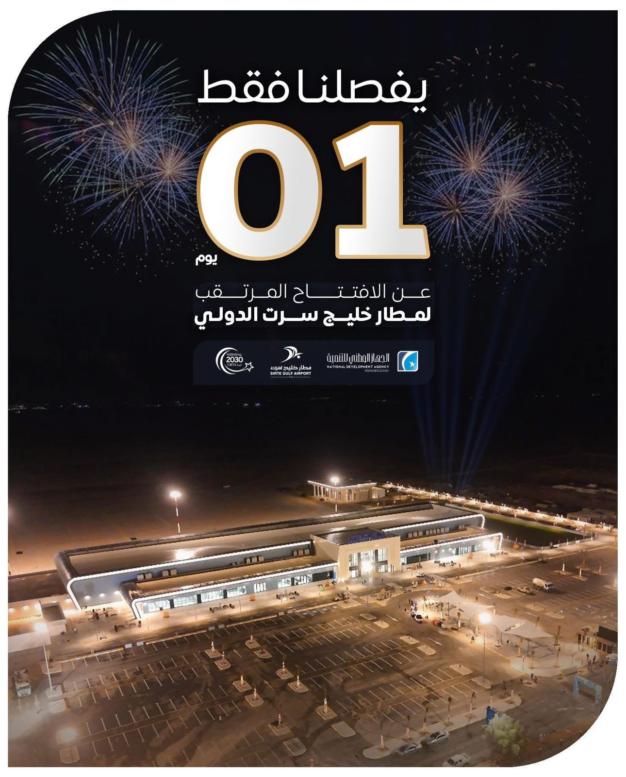 غدا السبت، افتتاح مطار خليج سرت الدولي، بعد استكمال الانتهاء من صيانته وتجهيزه وتطويره بأشراف الجهاز الوطني للتنمية.
