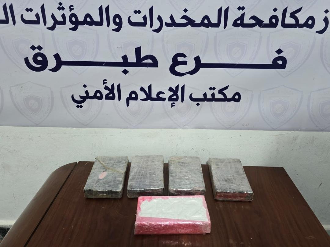 أعلن جهاز مكافحة المخدرات والمؤثرات العقلية فرع طبرق توقيف شخص بحوزته نحو 5 كيلوغرامات من مادة الكوكايين، وذلك بعد ورود معلومات تفيد بنقله كمية من الممنوعات برفقة عائلته إلى مدينة البيضاء.