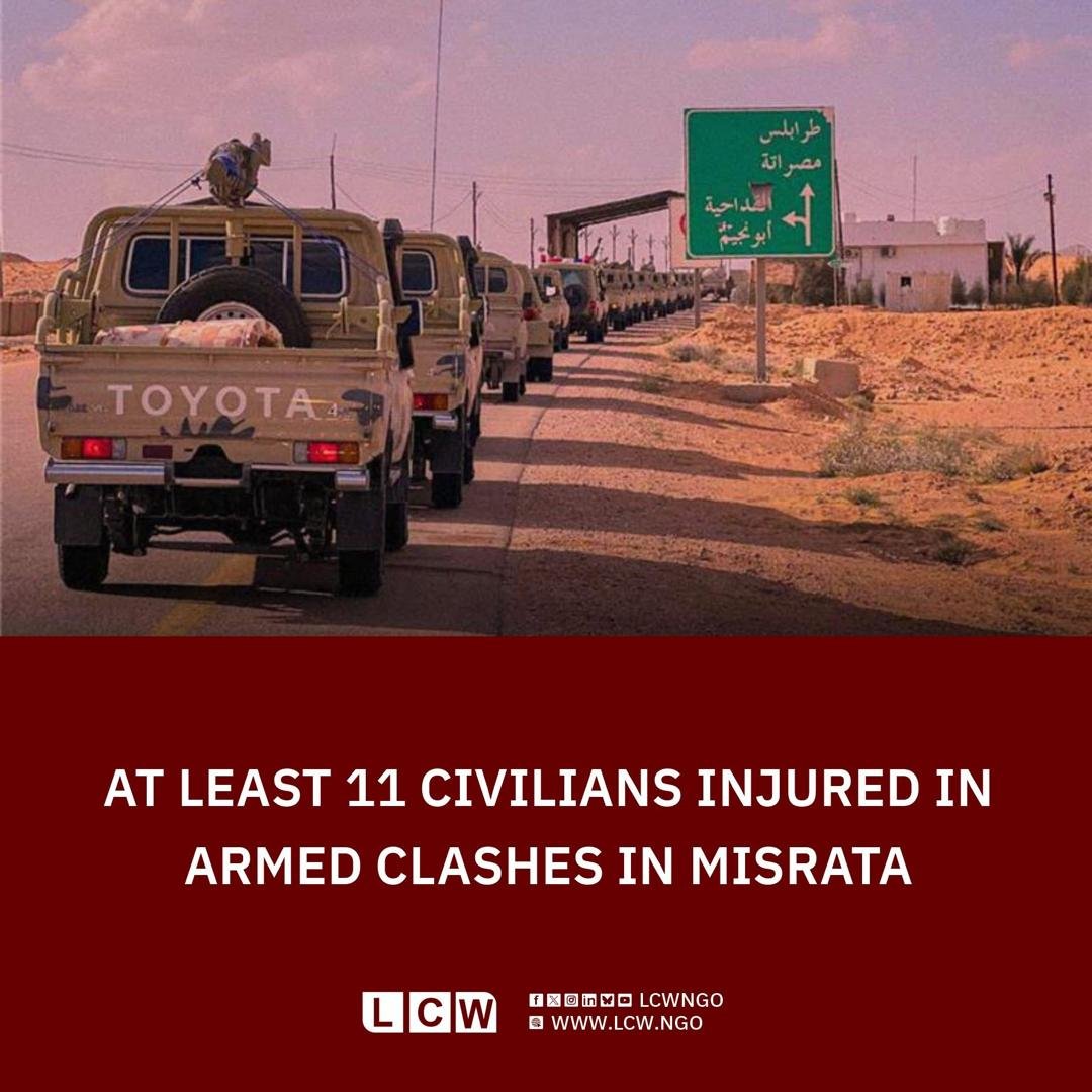 اكدت منظمة رصد الجرائم في ليبيا توثيقها لإصابة 11 مدنيًا على الأقل، من بينهم أربعة مهاجرين وطفل، أصيبوا بجروح متفاوتة نتيجة الرصاص العشوائي وشظايا قذائف، خلال الاشتباكات المسلحة التي اندلعت وسط الأحياء السكنية جنوب مدينة مصراتة، بين قوة العمليات المشتركة والكتيبة 24 التابعتين لحكومة الوحدة الوطنية المؤقتة.
